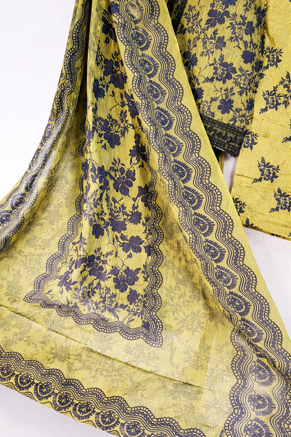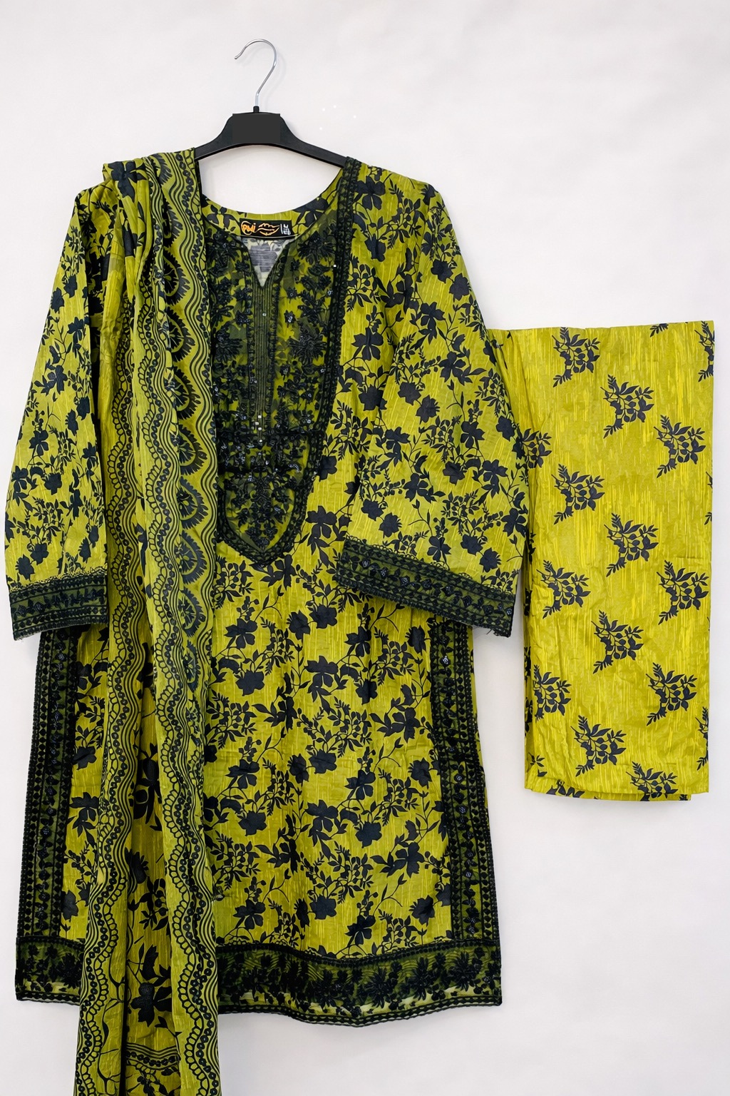 The ensemble includes a full-length floral print dupatta adorned with a black botanical pattern and geometric border, perfectly balancing vibrancy with elegance. A coordinated printed cotton pajama completes the look, embracing the trending all-over print style with a cohesive and modern finish.