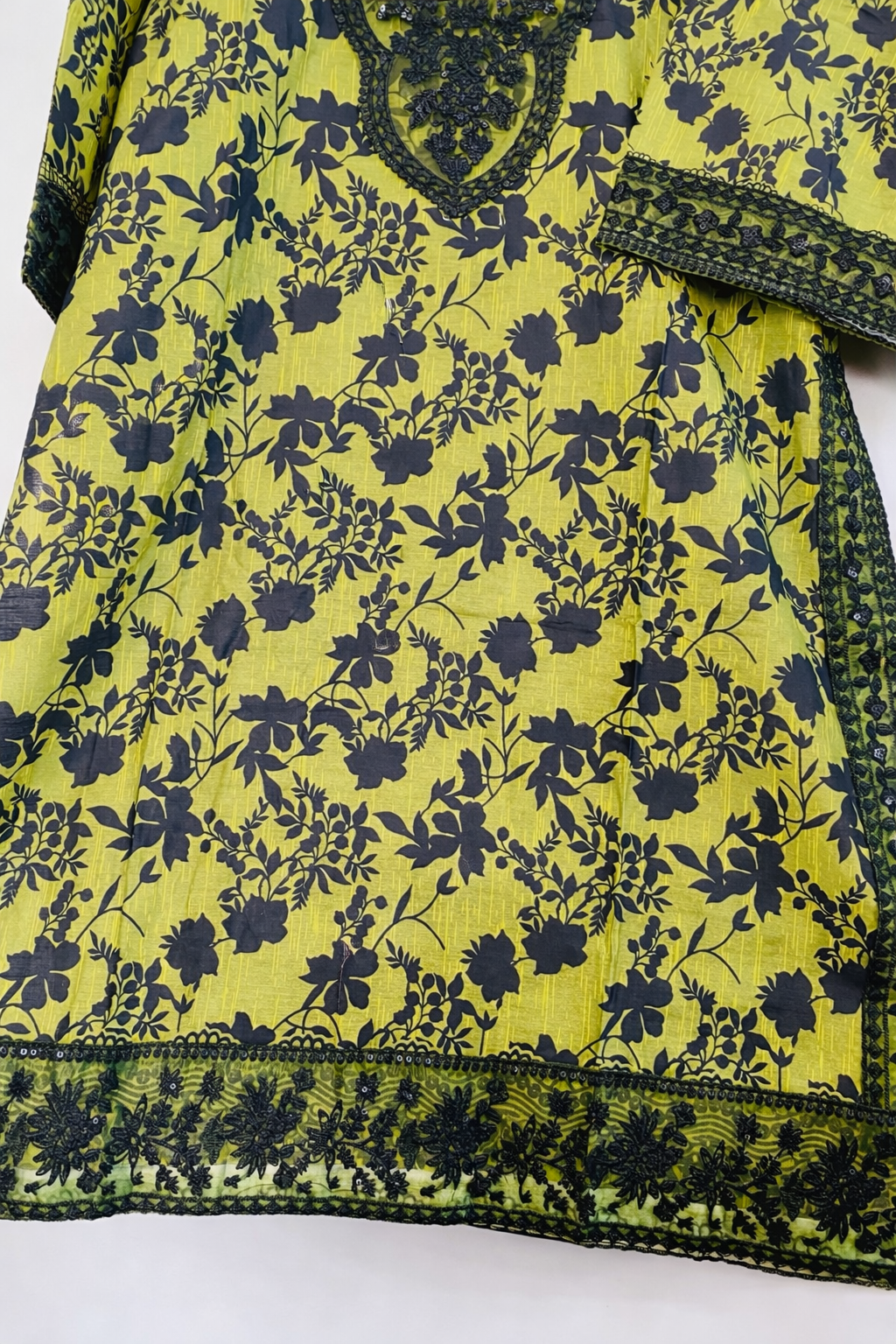 The neckline stands out with heavy black threadwork and 3D floral embroidery, delicately accented with sequins for a soft shimmer. Wide, intricate black lace and embroidered borders along the sleeves, side slits, and hem create a striking contrast against the bright fabric, adding depth and sophistication.