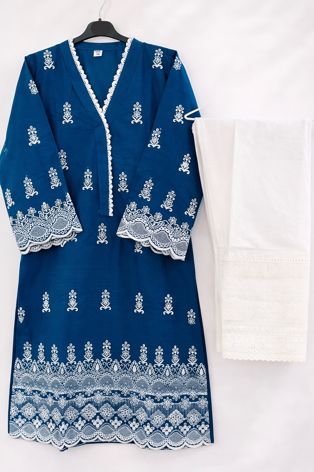 Delicate white floral embroidery along the neckline, sleeves, and hem adds timeless charm, blending traditional craftsmanship with modern appeal. Paired with a matching designed payjama, this set is perfect for festive gatherings, casual outings, or daytime events.